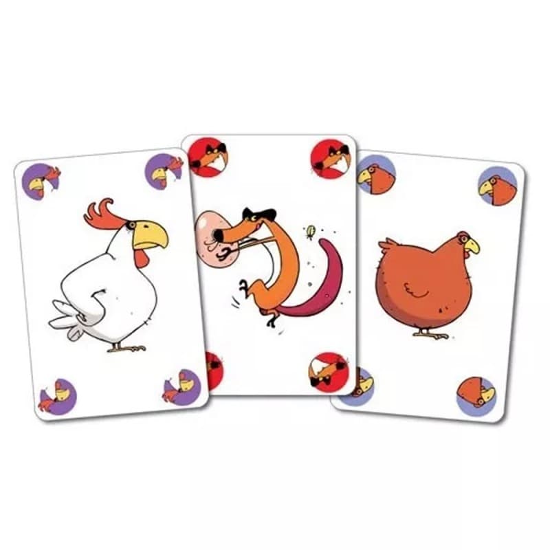 Cada jugador reúne cartas para formar huevos combinando gallina, gallo y nido. Luego debe hacerlos eclosionar antes de que otro jugador, con ayuda del zorro, se los robe. Si tienes dos gallos, puedes defender tu nido.