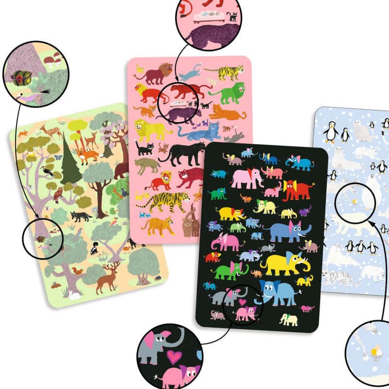 Myster Animo de Djeco es un juego de cartas ideal para los más pequeños, donde cada jugador debe encontrar rápidamente el animal que no pertenece a la escena mostrada. Un reto perfecto para estimular la observación, la concentración y la velocidad de reacción.
